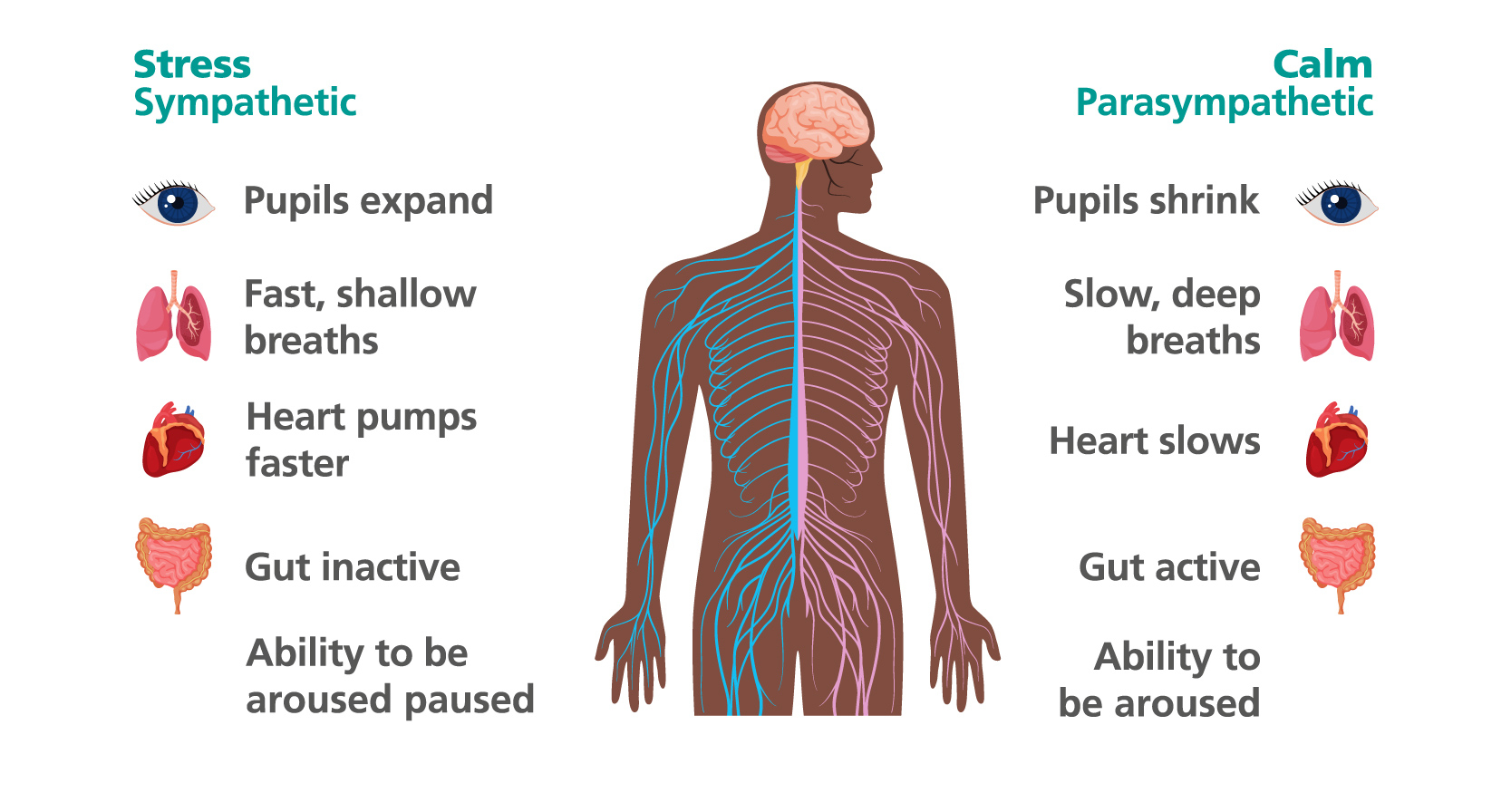 The image is a medical diagram - the impact of the ‘Stress’ or Sympathetic Nervous System and the ‘Calm’ or Parasympathetic Nervous System on the body.